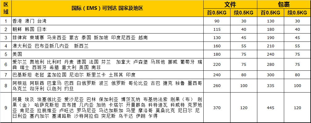 提示:具體通達(dá)國家及重量,尺寸標(biāo)準(zhǔn)來電咨詢!EMS報價變動性較大,交貨時請來電咨詢! 所有EMS出口件只包出口,不包目的地海關(guān)清關(guān)與簽收結(jié)果!