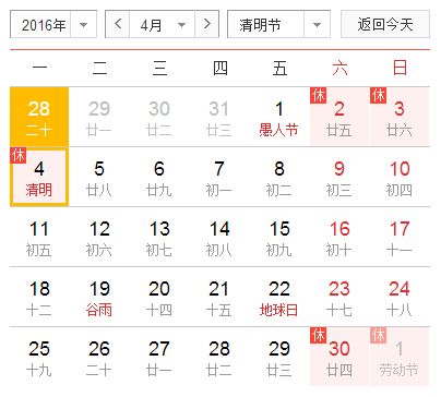 2016年4月4日(星期一)為國家法定節(jié)假日。