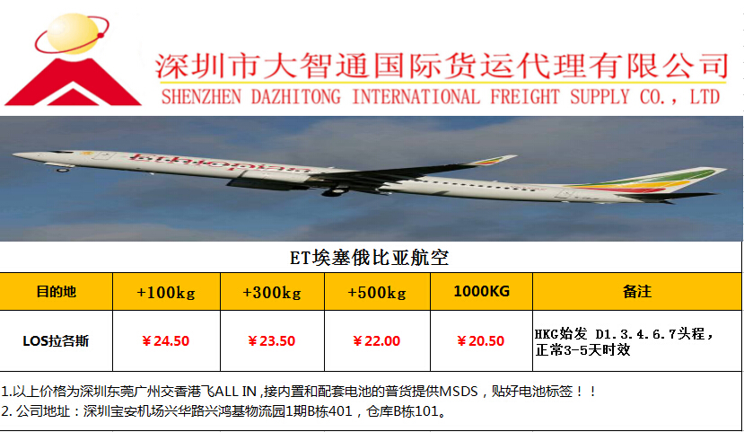 拉各斯空運(yùn)專線是我們深圳大智通國(guó)際貨運(yùn)公司新推出的國(guó)際空運(yùn)航線之一,由于是空運(yùn)專線服務(wù),所以就有優(yōu)勢(shì),拉各斯空運(yùn)價(jià)格方面也就非常實(shí)惠,噸價(jià)可以低到20.5元每公斤以下,每天都有航班直飛,走ET(埃塞俄比亞航空公司)歡迎廣大新老顧客朋友咨詢本公司關(guān)于拉各斯空運(yùn)專線的詳情