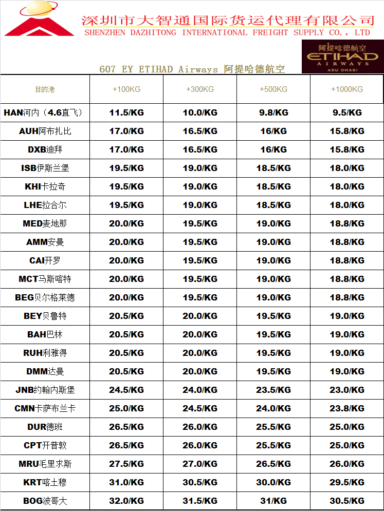 2.航班信息: 客機HKG-AUH-目的地Daily,貨機HKG-DAC-AUH-目的地 周1.4.6(每周四班貨機)