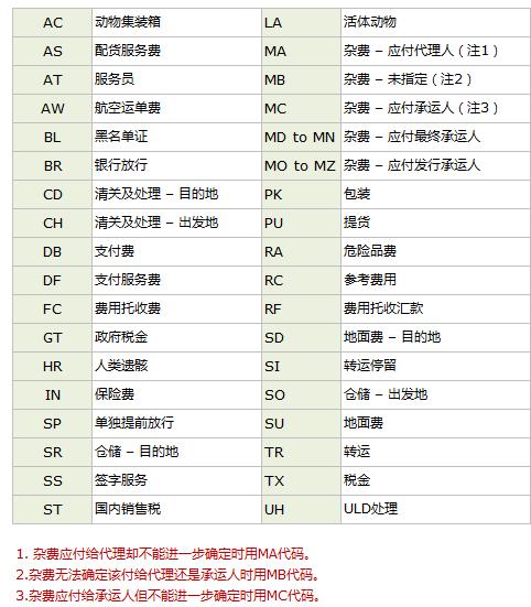 a.除了必需填寫(xiě)重量費(fèi)及從價(jià)費(fèi)之外的其它收費(fèi)及費(fèi)用的說(shuō)明及金額。電子傳送航空運(yùn)單時(shí),要使用下列代碼: