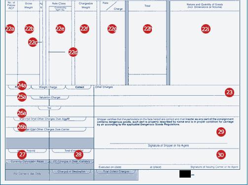 如果運(yùn)輸中使用一個(gè)或多個(gè)IATA注冊(cè)的ULD,在‘費(fèi)率分類’欄(22D)的‘x’一行填寫(xiě)適當(dāng)?shù)腎ATA注冊(cè)代碼。
