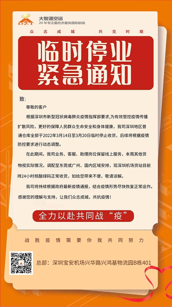 從3月14號(hào)開(kāi)始所有員工居家辦公,暫停收貨、停止轉(zhuǎn)運(yùn),已經(jīng)入庫(kù)深圳倉(cāng)庫(kù)的貨物未操作的待場(chǎng)所恢復(fù)營(yíng)業(yè)后操作。