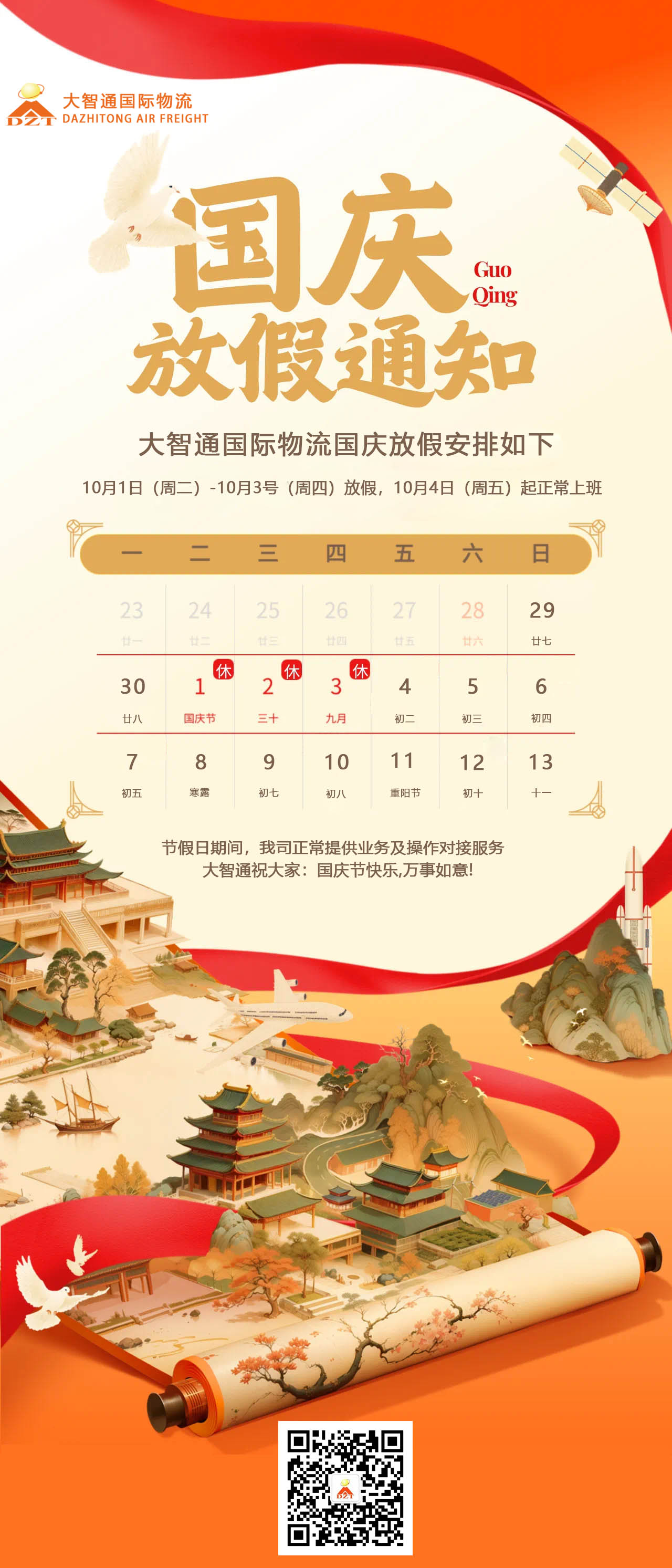 您好,正值國慶佳節(jié)歡度之際,深圳市大智通國際貨運代理有限公司全體員工在此感謝長期以來對我們的支持與厚愛!2024年我司“國慶節(jié)放假通知”如下:
